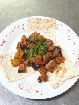 Сочные кусочки (баранина, курица, свинина, мясо на выбор) обжаренные с картофелем, луком, помидорами, подается с зеленью.